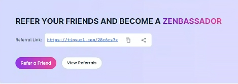 Look for the purple and white section titled “REFER YOUR FRIENDS AND BECOME A ZENBASSADOR.”